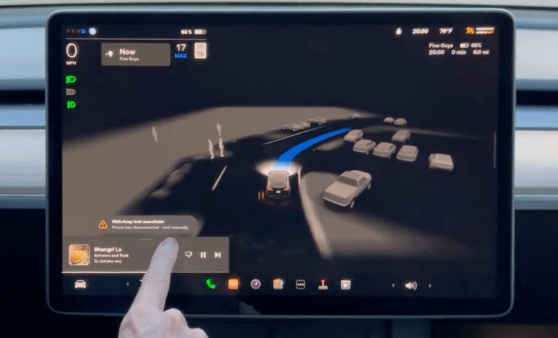 When the vehicle arrives at Five Guys, there are pedestrians crossing the street. Each person is sensed by Tesla’s Ai software, a testament to the high importance of safety in the entire realm of Tesla products.