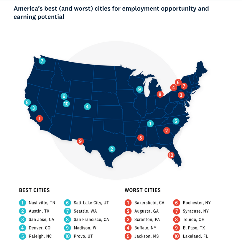 Austin is the #2 city in the nation for overall employment opportunity and earning potential in a study published by Chekr, an HR tech firm, in April 2023.  Having a job, making an honest living is a big part of building a happy, productive life.