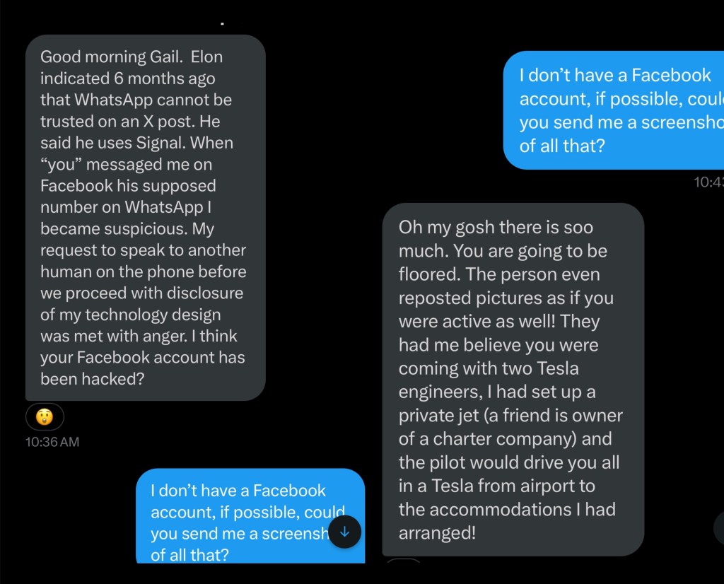 “Oh my gosh there is soo much. You are going to be floored. The person even reposted pictures as if you were active as well! They had me believe you were coming with two Tesla engineers, I had set up a private jet (a friend is owner of a charter company) and the pilot would drive you all in a Tesla from airport to the accommodations I had arranged.”