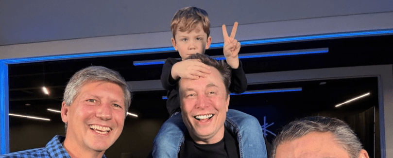 Dave Blundin, Lil X, Elon Musk, Peter Diamandes, in a photo posted to X on January 6, 2026. Taken in the lobby of Giga Texas.