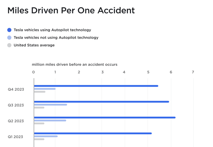 When Tesla Autopilot is used, it turns out that there is only one accident out of 5.5 Million miles driven. Tragically, without using the software, there is a staggering one accident after only 1 million miles driven (in a Tesla). But the US overall average is even worse. For every 500,000 miles, there is an accident. Lives are saved with Tesla Autopilot.