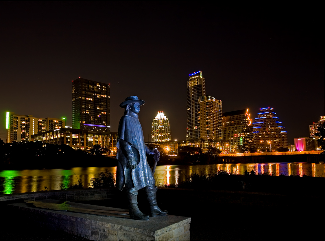 Courtesy @tracesoftexas on X. I took this photo of the Stevie Ray Vaughan statue on Lady Bird Lake in Austin in 2011, illuminating Stevie with a flashlight over which I placed a blue filter. The skyline has changed so much since then.