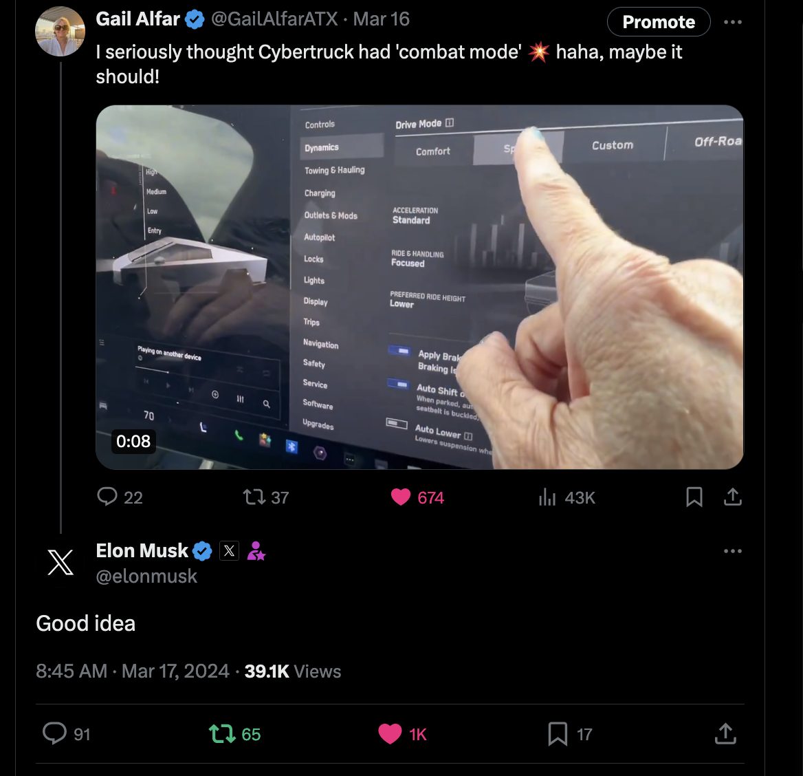 Near the start of this podcast, I mistakenly thought COMFORT MODE in the Cybertruck was COMBAT MODE. I shared a 14-second video in which I jokingly asked Elon Musk to install Combat Mode in the Cybertruck. To which Elon replied, “Good Idea.”