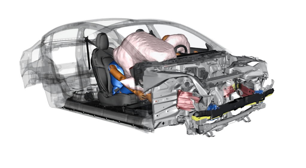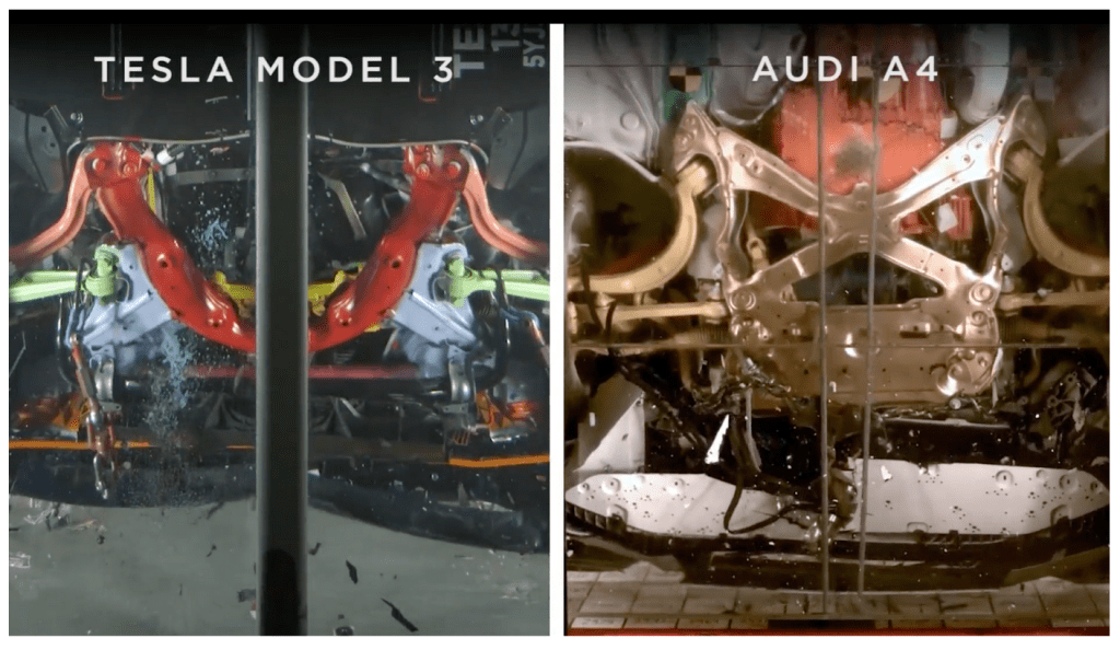 It starts with the structural design of the vehicle. In traditional combustion engine (ICE) cars, the front of the vehicle is filled with an engine that gets pushed in towards the cabin in the event of a crash.