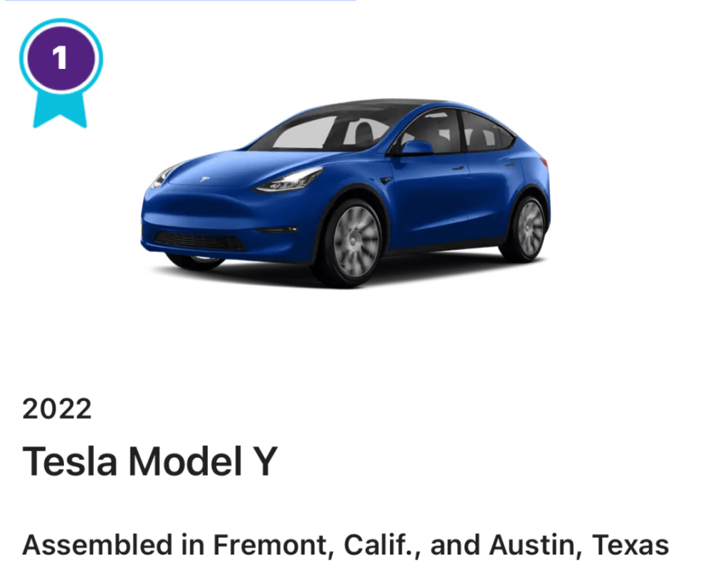 Tesla Model Y won first place for most American-made car in 2022. That’s because Model Y is made in the USA with the majority of parts also made in the USA.