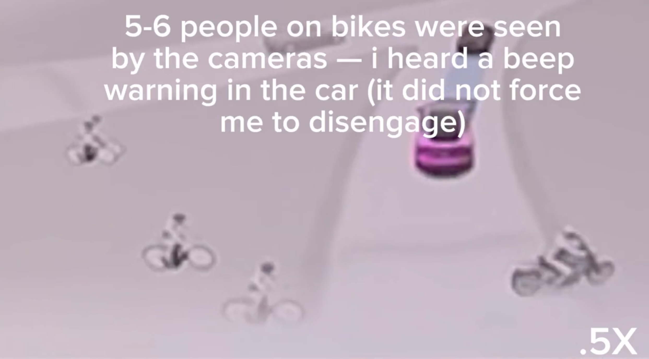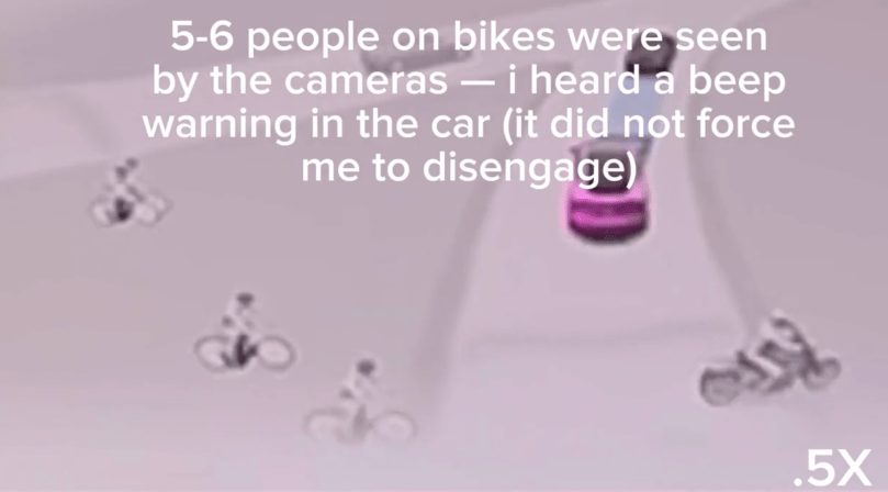 One striking portion of this podcast occurs when a bicycle team of at least 6 people moves quickly toward a crosswalk at the very same moment the Tesla (on FSD BETA) is approaching the crosswalk.