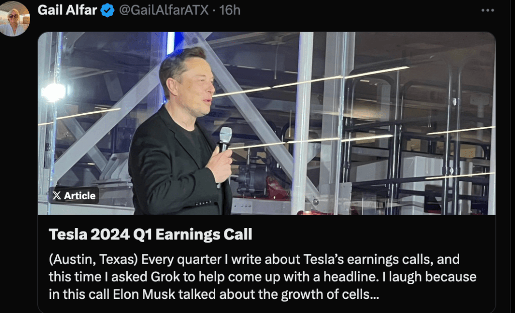 (Austin, Texas) Every quarter I write about Tesla’s earnings calls, and this time I asked Grok to help come up with a headline. I laugh because in this call Elon Musk talked about the growth of cells into a baby. You’ll never guess the funny headline Grok came up with: “Tesla’s Metamorphosis: Elon Musk’s Plan for a Leaner, Meaner, and More Efficient Future”