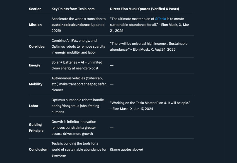 “The ultimate master plan of Tesla is to create sustainable abundance for all.” (X, March 21, 2025)