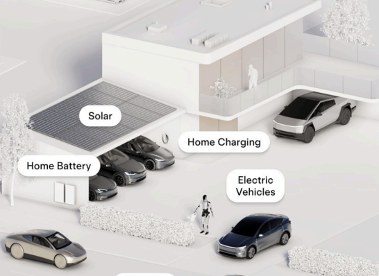 Tesla’s image depicts a shared home with a solar roof, home powerwalls, electric cars and a helpful bot watering plants.