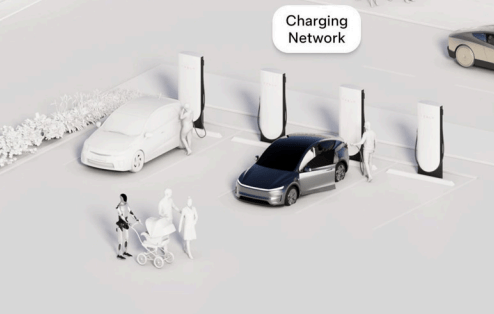 Tesla’s image depicts Supercharging, with electric cars other than Teslas, and it also shows a Bot helping a family by pushing a stroller.