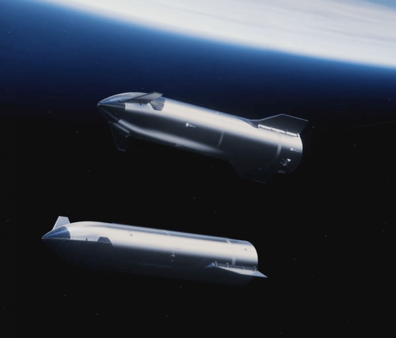 Listen, you’ve got to transfer fluid somehow, it’s just got to be done! So the two Starships would get together, and one Starship would transfer fuel and oxygen, and most of the mass is oxygen. It is almost 80% oxygen that gets transferred. A little over 20% fuel and so you send a Starship to orbit that is full of payload and then you send up a bunch of other Starships up and then you would refill the propellant on that Starship. And once the propellant tanks are mostly full then you can depart for Mars or the Moon.