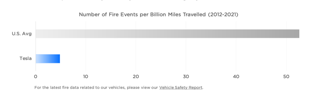 From 2012 – 2021, there has been approximately 5 Tesla vehicle fires for every billion miles traveled.